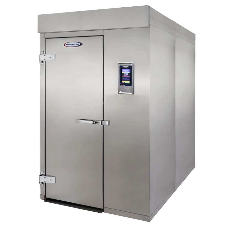 Revolutionize Cold Chain Dynamics with the American Panel Corporation AP46BC-2T Blast Chiller. Designed specifically for commercial restaurant use, this roll-in chiller is a game-changer in the food industry. With its remote refrigeration system, it can accommodate up to two trolleys measuring 35" W x 39" D x 73.5" H, allowing for efficient and convenient chilling of large quantities of food. Boasting an impressive chill capacity, this chiller can cool 920 lbs. from 160F to 38F in just 90 minutes or 1060 lbs. in 120 minutes. The 7" LCD touch screen controller with Quick Start & A La Carte functionality makes operation a breeze. The insulated panels and camlock assembly ensure optimal temperature retention, while the stainless steel interior and exterior guarantee durability and easy cleaning. Trust American Panel Corporation to deliver top-notch quality and performance. Upgrade your restaurant's cold chain management with the AP46BC-2T Blast Chiller.