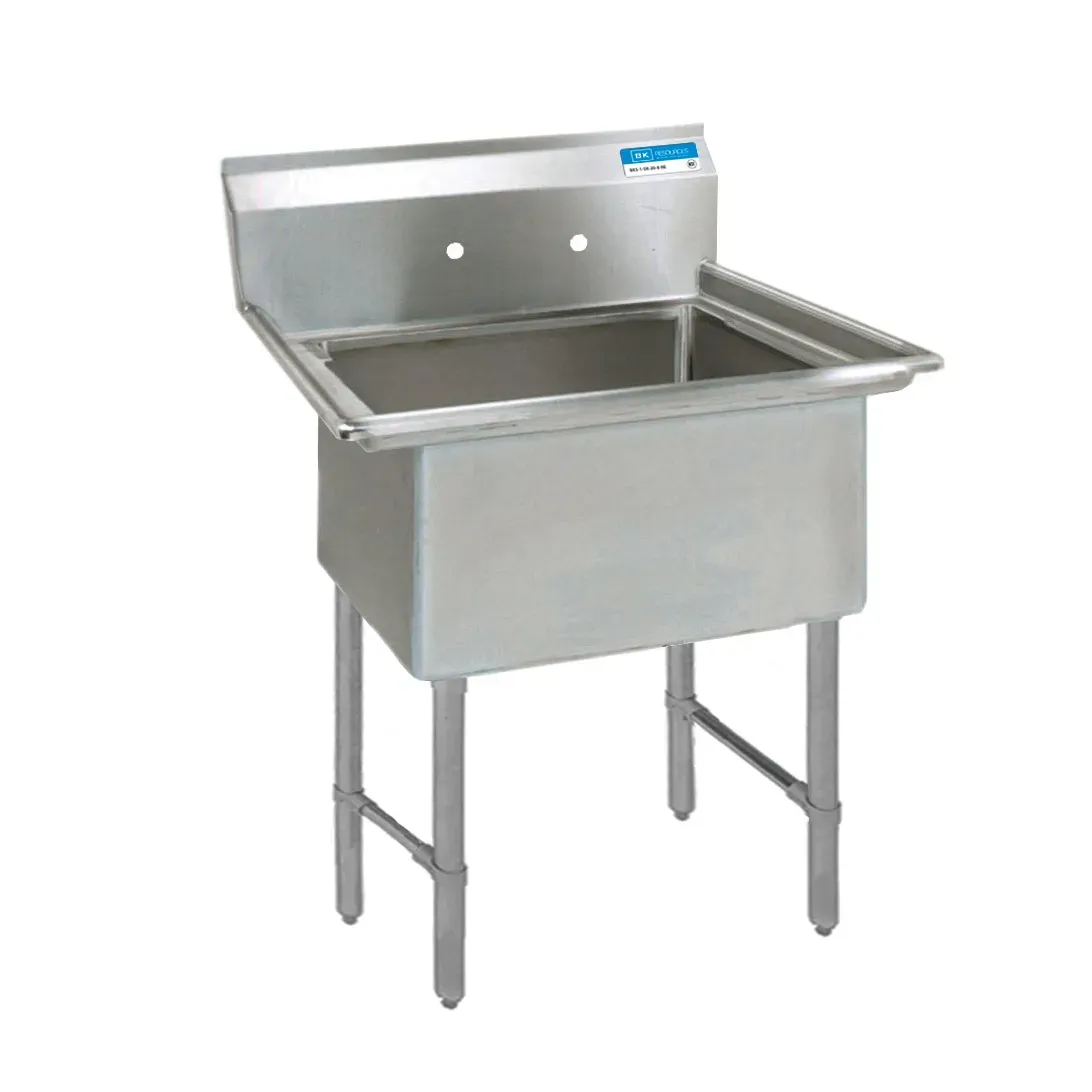 Cook with confidence using the BK Resources BKS-1-18-12S Sink, (1) One Compartment. This high-quality sink is designed specifically for commercial restaurant use, ensuring durability and functionality. With an overall size of 23"W x 23-13/16"D x 43-3/4"H, it provides ample space for all your washing needs. The 18" wide x 18" front-to-back x 12" deep compartment is perfect for washing large pots, pans, and dishes. The 9"H backsplash and 8" OC splash mount faucet holes make it easy to keep the surrounding area clean and tidy. Made from 18/304 stainless steel, this sink is resistant to corrosion and built to last. The stainless steel legs and side crossbracing provide stability, while the adjustable bullet feet ensure easy leveling on any surface. NSF certified, this sink meets the highest standards of cleanliness and sanitation. Upgrade your restaurant kitchen with the BK Resources BKS-1-18-12S Sink and experience the convenience and reliability it offers.