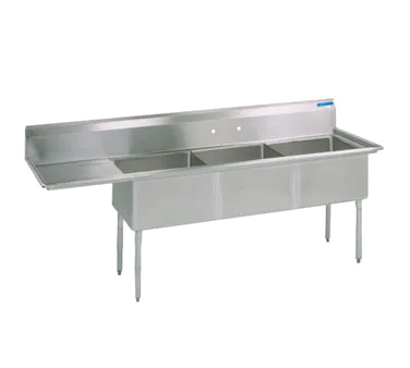 Transform your food service with the BK Resources, BKS-3-15-14-15LS Sink. This three-compartment sink is designed to meet the demands of a busy commercial restaurant. With its 62-1/2" width, it provides ample space for washing, rinsing, and sanitizing dishes, utensils, and cookware. The sink features 15" wide x 15" front-to-back x 14" deep compartments, allowing for efficient cleaning and organization. The 15" drainboard on the left provides a convenient area for drying dishes, while the 9" backsplash helps to prevent water splashes and spills. The sink is constructed with 18/304 stainless steel, ensuring durability and resistance to corrosion. It also includes basket drains for easy waste disposal. The stainless steel legs and side bracing provide stability, and the adjustable stainless steel over plastic bullet feet allow for easy leveling. NSF certified, this BK Resources sink is a reliable and essential addition to any commercial restaurant kitchen.
