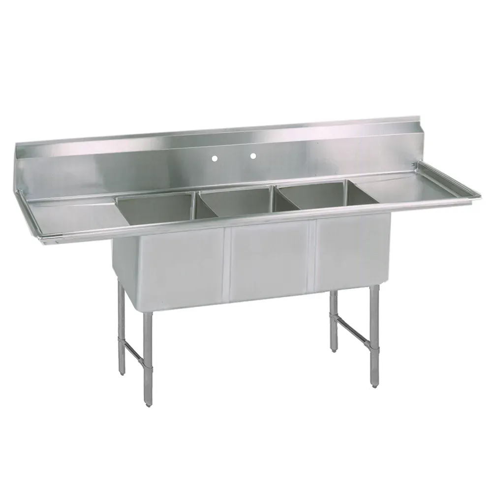 Elevate your culinary experience with the BK Resources, BKS6-3-1824-14-18TS Sink. This three-compartment sink is designed to meet the demands of a busy commercial restaurant. With its generous size of 93-1/4"W x 29-1/2"D x 44-1/16"H overall, it provides ample space for washing, rinsing, and sanitizing dishes. The 18" wide x 24" front-to-back x 14" deep compartments are perfect for accommodating large pots, pans, and utensils. The sink features two drainboards, one on each side, allowing for efficient workflow and organization. The 10"H backsplash and 8 OC splash mount faucet holes ensure a clean and sanitary work environment. Made of 16/304 stainless steel, this sink is durable and easy to clean. The rounded front and side edges provide added safety and comfort. With adjustable stainless steel legs and side bracing, as well as stainless steel over plastic bullet feet, this sink offers stability and versatility. NSF certified, this BK Resources sink is a reliable and essential addition to any commercial kitchen.