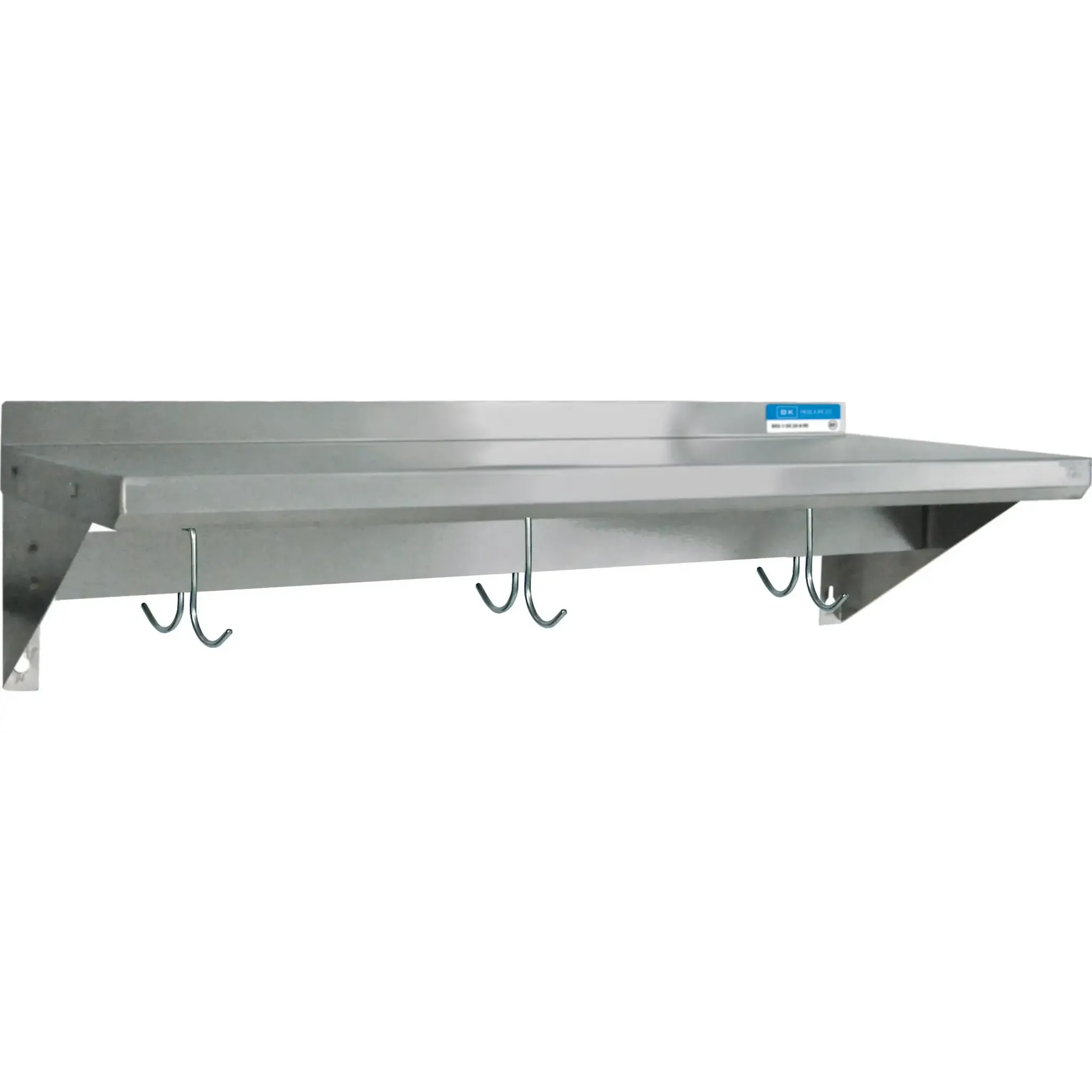 Elevate your dining experience with the BK Resources BKWSE-1648-PR Overshelf, Wall-Mounted with Pot Rack. This economy overshelf is designed to enhance the functionality and efficiency of your commercial restaurant kitchen. Made of durable 18/430 stainless steel, it ensures long-lasting performance even in the busiest of kitchens. The 48"W x 16"D size provides ample space for storing and organizing your kitchen essentials, while the 1-1/2"H rear up-turn prevents items from falling off the shelf. The two 11-1/2" angle supports offer sturdy wall mounting, ensuring stability and safety. Additionally, the five stainless steel double prong hooks (BKSSDPH) provide a convenient solution for hanging pots, pans, and utensils, keeping them within easy reach. NSF certified, this wall-mounted overshelf with pot rack meets the highest standards of sanitation and hygiene. Trust BK Resources to deliver reliable and functional equipment for your commercial kitchen needs.