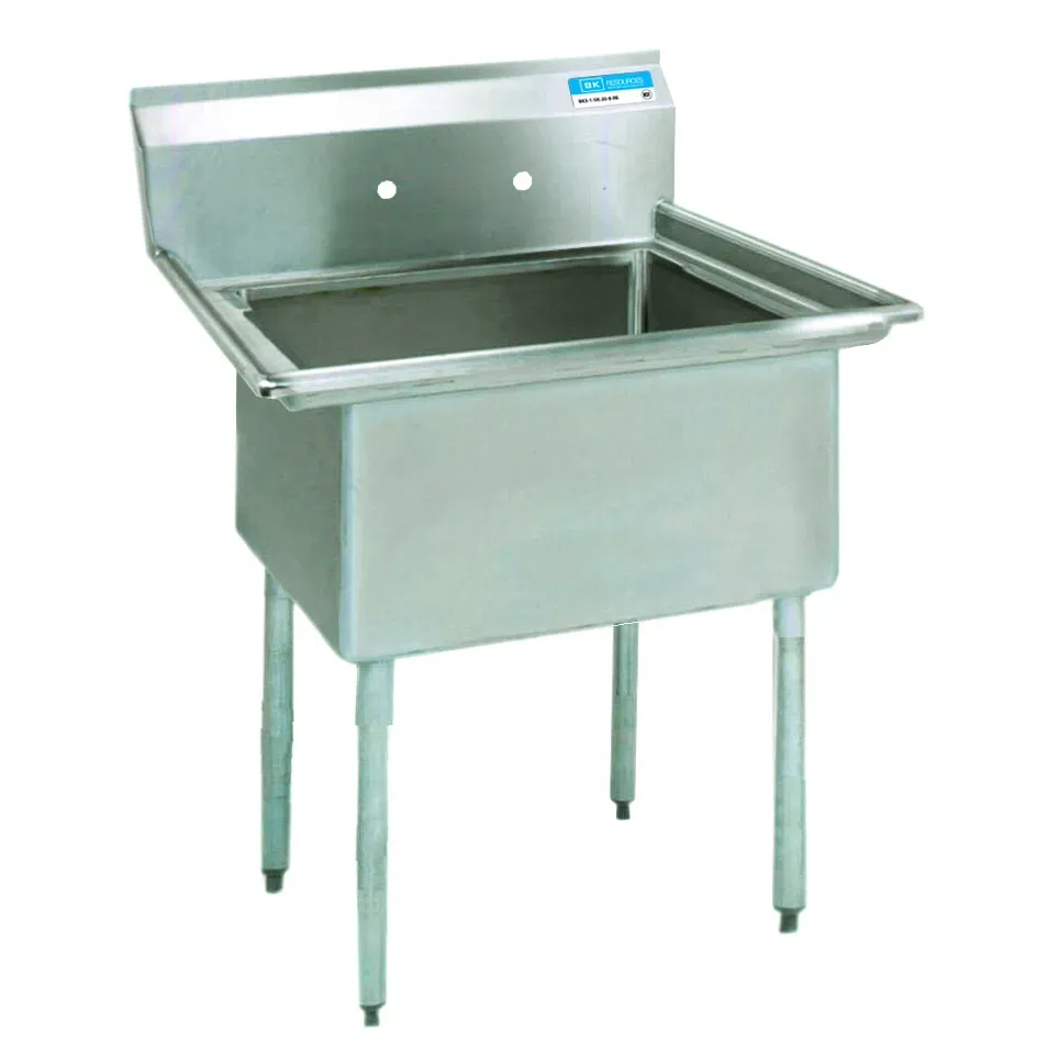 Introducing the BK Resources, ES-1-18-12 Sink, (1) One Compartment - the perfect addition to drive restaurant profitability. This economy sink is designed to meet the demands of a busy commercial kitchen, ensuring efficiency and durability. With its 18 gauge stainless steel deck and bowls, this sink is built to withstand the rigors of daily use, while the galvanized legs and adjustable high impact corrosion resistant feet provide stability and longevity. The 18 wide x 18 front-to-back x 12 deep compartments offer ample space for washing and rinsing dishes, while the 9H backsplash helps maintain a clean and sanitary work area. The rounded front and side edges not only enhance the sink's aesthetics but also make it easier to clean. Additionally, the 8 OC splash mount faucet holes and drain included provide convenience and functionality. NSF certified, this BK Resources sink is a reliable and practical choice for any commercial restaurant.