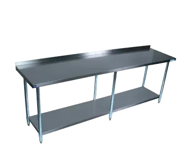 Kitchen innovation at its best, the BK Resources SVTR-1896 Work Table is a must-have for any commercial restaurant. With its 96"W x 18"D stainless steel top, this work table provides ample space for food preparation, making it ideal for busy kitchens. The turndown edges on the front and sides ensure that spills and messes are contained, while the reinforced channels add durability and strength. The 1-1/2" rear riser helps to keep items from falling off the back of the table, while the adjustable stainless steel undershelf provides additional storage space. The 1-5/8" dia. stainless steel legs and stainless steel over plastic adjustable bullet feet ensure stability and easy leveling. NSF certified, this work table meets the highest standards of cleanliness and sanitation. Upgrade your kitchen with the BK Resources SVTR-1896 Work Table and experience the convenience and efficiency it brings to your restaurant operations.