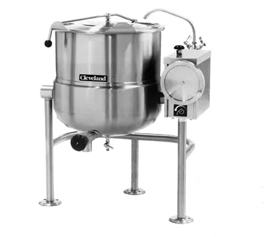 Introducing the Cleveland KDL125T Kettle, Direct Steam, Tilting a must-have for precision in every task. Designed for commercial restaurant use, this 125-gallon capacity kettle is built to deliver exceptional performance and efficiency. Its 2/3 steam jacket design ensures even heat distribution, allowing for consistent cooking results. The stainless steel exterior finish not only adds durability but also gives it a sleek and professional look. With a 35 psi rating and a steam control valve, this kettle provides precise control over the cooking process, ensuring optimal results every time. The open quad-leg base with flanged feet offers stability and easy maneuverability. The optional cover and draw-off further enhance its versatility, making it perfect for a wide range of cooking applications. Trust Cleveland to deliver the highest quality equipment that meets the demands of a busy commercial kitchen.