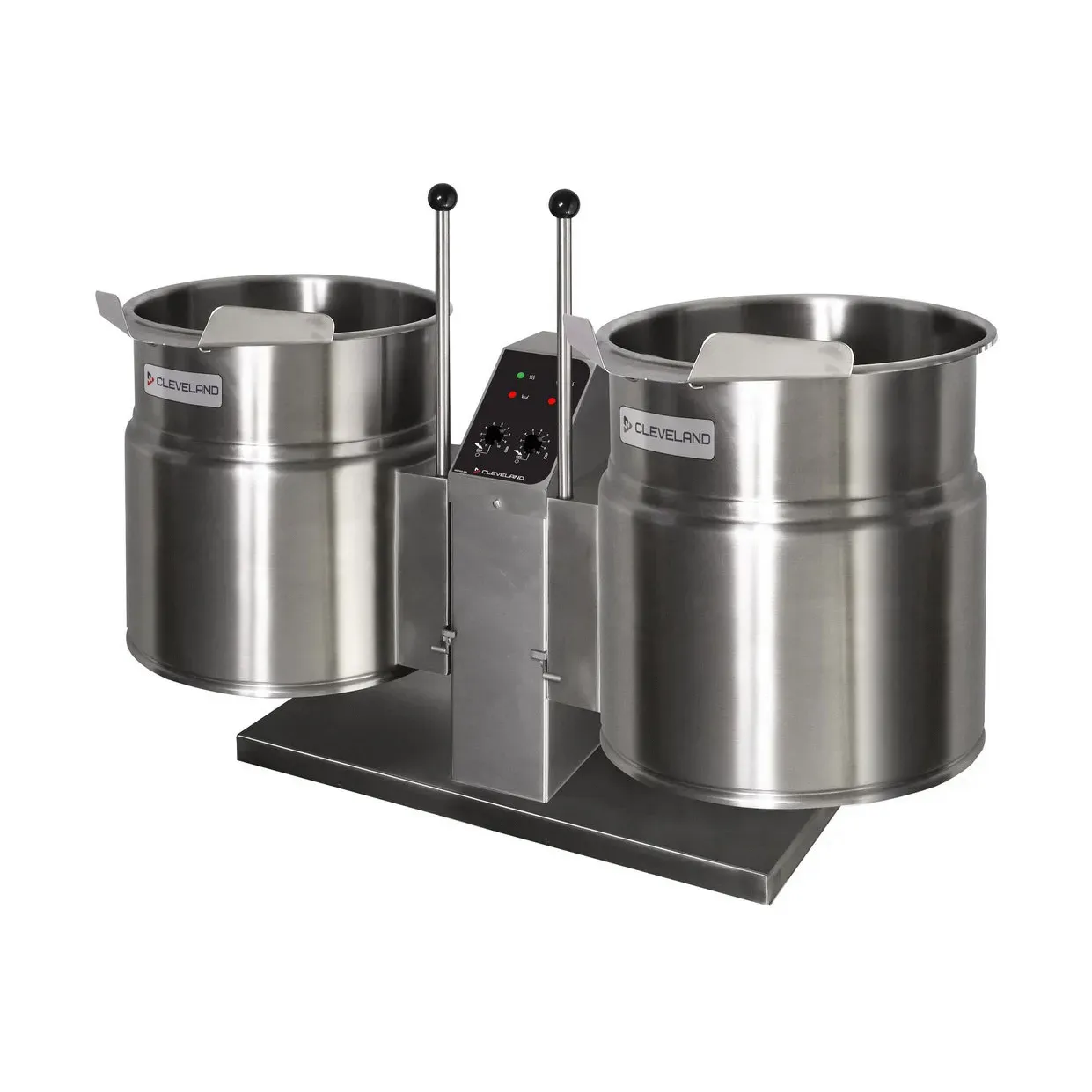 Bring precision to culinary tasks with the Cleveland TKET12T Electric Countertop Kettle. Designed for commercial restaurant use, this twin unit kettle offers a 12-gallon (45L) capacity in each kettle, allowing you to efficiently prepare large quantities of soups, stews, and sauces. The 2/3 steam jacket design ensures even heat distribution, while the lever-style tilting mechanism and anti-drip pour spout make pouring a breeze. With IPX6 water protection controls and a self-locking marine-style safety latch, this kettle prioritizes safety in a busy kitchen environment. The reinforced rolled rim and stainless steel construction with a 316 series stainless steel liner guarantee durability and longevity. Whether you're a bustling restaurant or a catering service, the Cleveland TKET12T Electric Countertop Kettle is the perfect addition to your kitchen, providing reliability, efficiency, and exceptional performance.