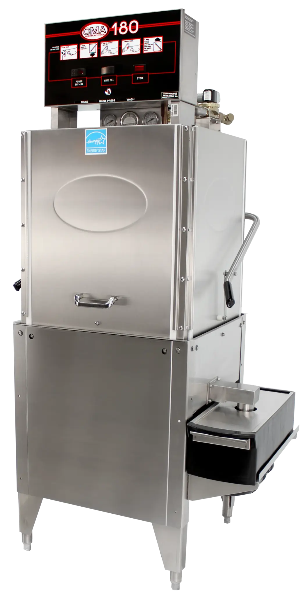 Transform your food service with the CMA Dishmachines, 180SB, Dishwasher, Door Type. This high-quality dishwasher is designed to meet the demands of a busy commercial restaurant. With its straight-thru design and top-mounted control box, it offers convenience and efficiency. The built-in booster heater ensures high-temperature sanitizing, providing a hygienic clean for your dishes. The dishwasher has a capacity of 60 racks per hour, allowing you to handle large volumes of dishes with ease. The external Poly Pro scrap accumulator helps to keep your dishwasher running smoothly by collecting food debris. Made of stainless steel, this dishwasher is durable and easy to clean. It also includes one open rack and one peg rack, providing versatility for different types of dishes. With its ENERGY STAR certification and NSF, UL, cULus approvals, you can trust that this dishwasher meets the highest standards of quality and efficiency. Upgrade your restaurant's dishwashing capabilities with the CMA Dishmachines, 180SB, Dishwasher, Door Type.