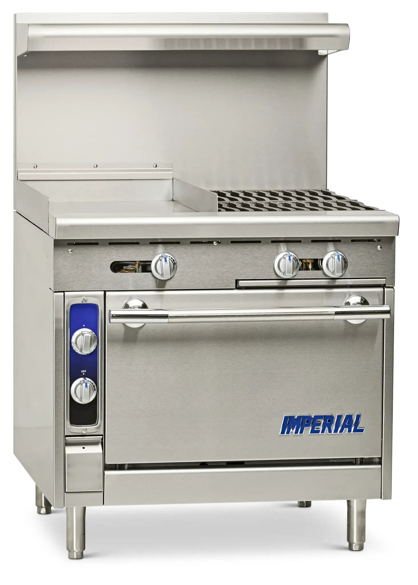 Unleash your inner chef with the Imperial IHR-3HT-3-C Range, a heavy-duty gas range designed to elevate your culinary creations in a commercial restaurant setting. This Diamond Series range features three open burners and three 12" hot tops, allowing you to simultaneously cook a variety of dishes with precision and efficiency. The cast iron grates provide even heat distribution, ensuring consistent cooking results every time. The convection oven, equipped with three chrome racks, offers versatile baking options for your delectable desserts and savory dishes. With manual controls and a removable crumb tray, this range is easy to operate and maintain. Its stainless steel construction, including the front, sides, landing ledge, backguard, and kick plate, not only adds durability but also enhances the aesthetic appeal of your kitchen. The adjustable feet and 6" legs provide stability and flexibility in any kitchen layout. With a powerful 1/4 HP and 245,000 BTU, this range delivers the performance and reliability that every professional chef desires. Trust Imperial to bring out the best in your culinary skills.