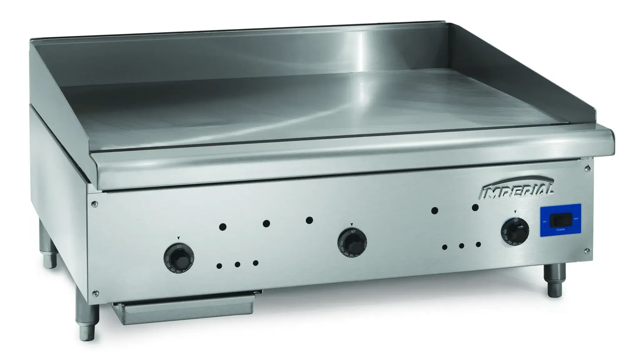 Maximize your food service potential with the Imperial ISAE-60 Gas Countertop Griddle. This high-quality griddle is designed to meet the demands of a busy commercial restaurant kitchen. With a spacious 60" W x 24" D cooking surface, you'll have plenty of room to cook multiple items at once, increasing efficiency and productivity. The 1" thick smooth steel plate ensures even heat distribution, resulting in perfectly cooked food every time. The snap action thermostat allows for precise temperature control, giving you the flexibility to cook a variety of dishes. The 4" wide grease gutter and removable grease can make cleaning up a breeze, while the stainless steel front, sides, ledge, and splash guards provide durability and easy maintenance. With 120000 BTU of power, this griddle can handle even the busiest of kitchens. Trust Imperial to deliver exceptional performance and reliability for your restaurant.