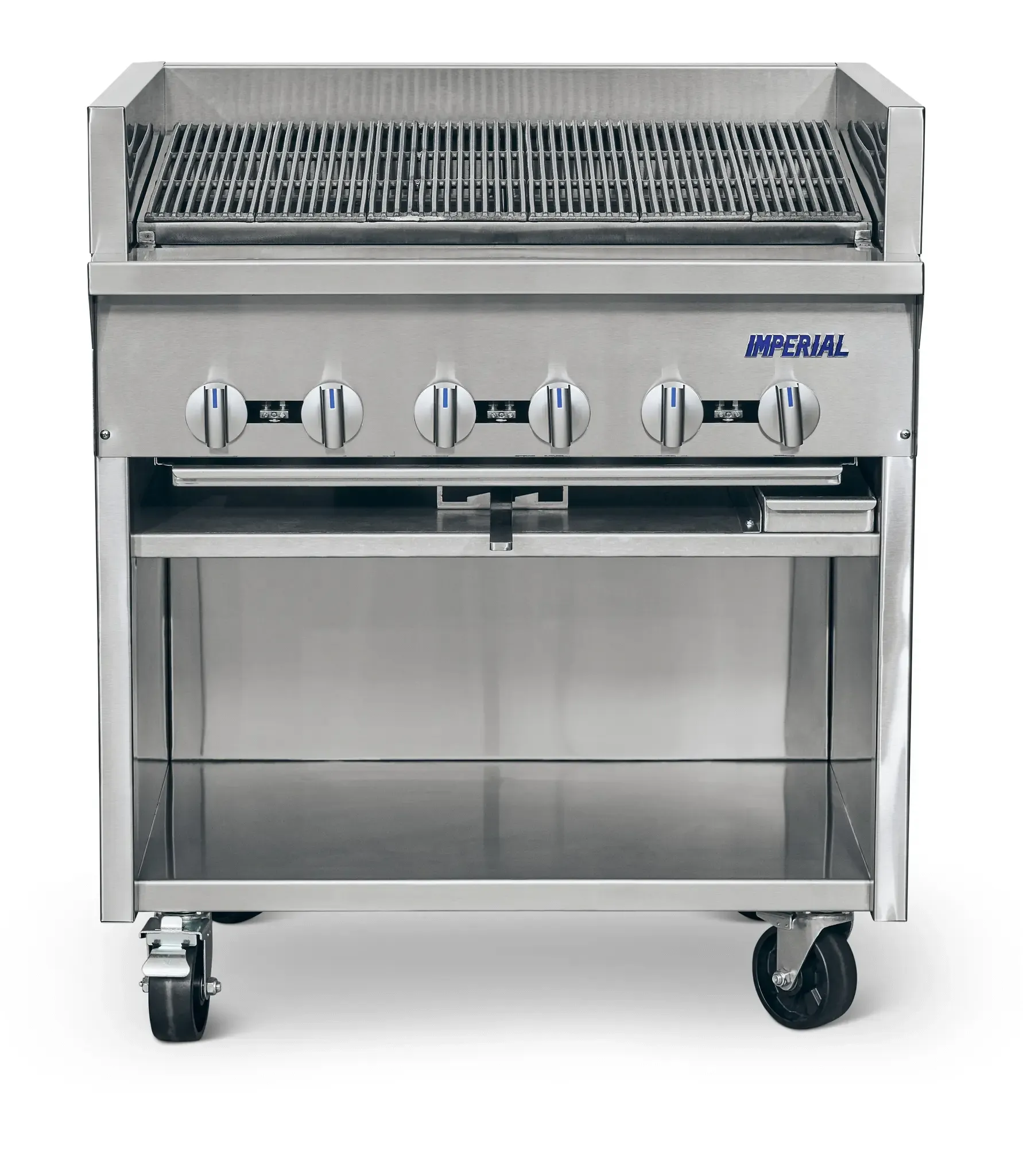 Cook with confidence and flair using the Imperial IABF-72 Gas Floor Model Charbroiler. This high-quality charbroiler is designed to meet the demands of a commercial restaurant kitchen. With its 72" size and 12 stainless steel burners, it provides ample cooking space and powerful heat output of 240,000 BTU. The slanted, 3-position cast iron top grate allows for versatile cooking options. The open cabinet base provides convenient storage for utensils and other cooking essentials. Cleaning is a breeze with the full-width grease gutter and removable grease can. Made with durable stainless steel construction, this charbroiler is built to last. It is cETLus, ETL, and NSF certified, ensuring its safety and reliability. Upgrade your restaurant kitchen with the Imperial IABF-72 Gas Floor Model Charbroiler and elevate your cooking game.