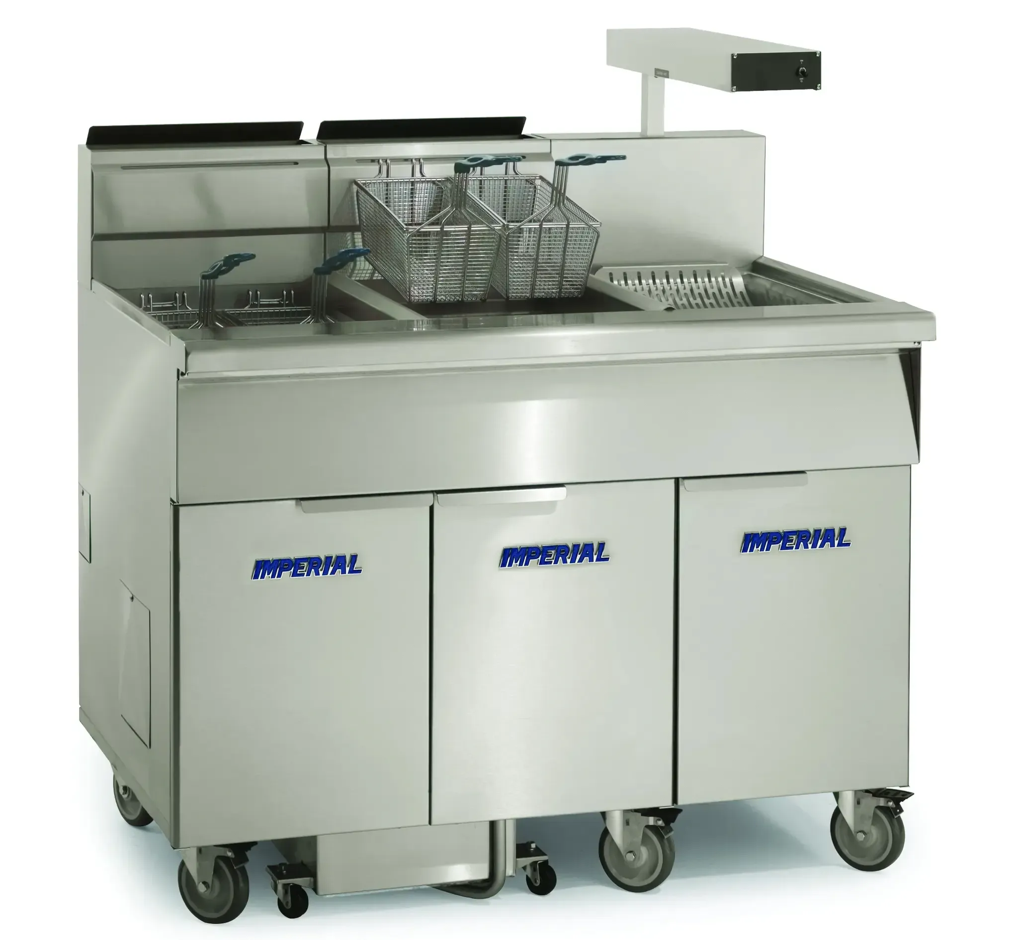 Upgrade your restaurant kitchen with the Imperial, IFSCB575-OP-T, Gas Fryer. This floor model fryer is equipped with five batteries, each with a 75lb. capacity, making it perfect for high-volume cooking. The open pot design and built-in filter system ensure efficient frying and easy maintenance. With a 5.5 GPM roller pump and electronic thermostat, you can achieve precise temperature control for consistent results. The fryer also includes a drain station, cabinet, food warmer, dump pan, joiner strips, and a filter starter kit, providing everything you need for a seamless cooking experience. Made with stainless steel construction on the frypot, front, sides, landing ledge, and cabinet, this fryer is durable and easy to clean. The casters allow for easy mobility, and the 120v/60/1-ph power supply ensures reliable performance. Upgrade your kitchen with the Imperial, IFSCB575-OP-T, Gas Fryer and experience enhanced efficiency and productivity in your commercial restaurant.