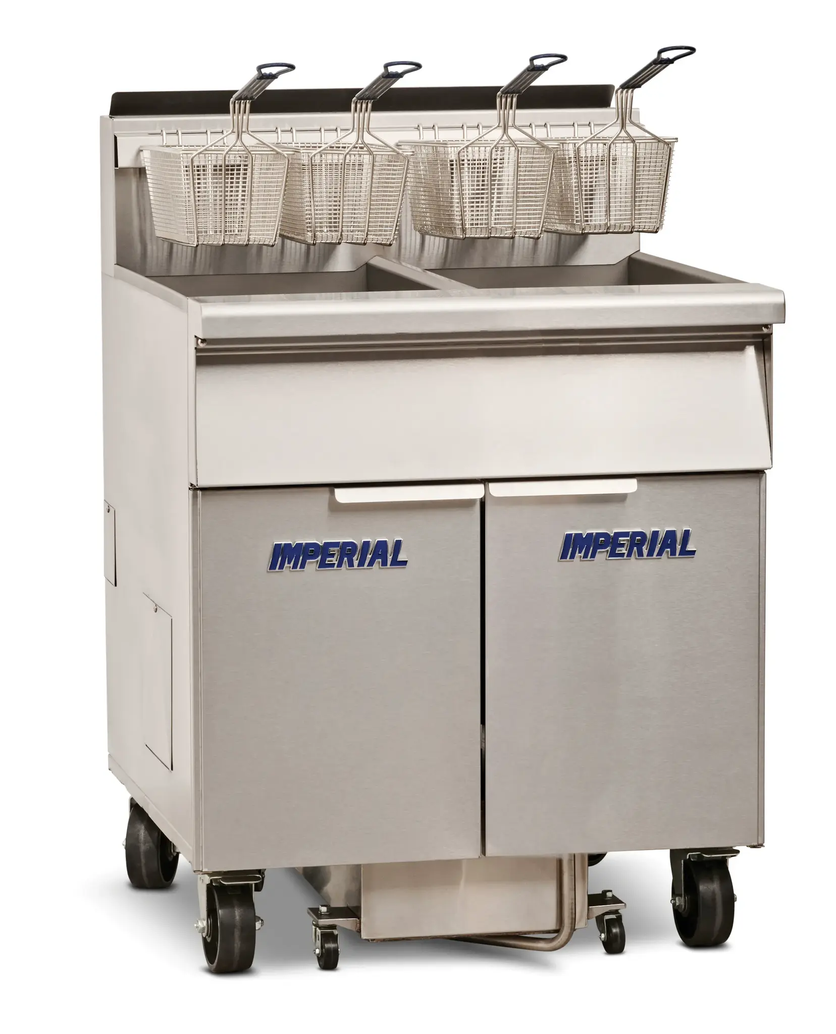 Introducing the Imperial, IFSSP275EUC, Fryer, Electric, Multiple Battery - the perfect solution to simplify restaurant operations. This floor model fryer is designed to meet the demands of a busy commercial kitchen, with a 75lb. capacity in each of its two frypots. The tilt-up elements make cleaning and maintenance a breeze, while the built-in space saver filter system ensures that your oil stays clean and extends its lifespan. The computer controls allow for precise temperature regulation, ensuring consistent and delicious results every time. With a 5.5 GPM roller pump, this fryer can handle high-volume frying with ease. The stainless steel construction of the frypot, front, and sides ensures durability and easy cleaning. Plus, the casters make it easy to move the fryer around your kitchen as needed. Simplify your restaurant operations with the Imperial, IFSSP275EUC, Fryer, Electric, Multiple Battery.