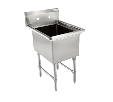 Maximize convenience using efficient tools with the John Boos, 1B184, Sink, (1) One Compartment. This stainless steel sink is designed to meet the demands of a busy commercial restaurant kitchen. With its 1-compartment design, measuring 23W x 23-12D x 44H overall, it provides ample space for washing and rinsing dishes, utensils, and cookware. The 18W x 18 front-to-back x 14 deep compartment is perfect for accommodating large pots and pans. The sink features a 10H boxed backsplash with a 45 top and 2 return, ensuring a clean and sanitary work area. It also includes a set of splash mount faucet holes with 8 centers, allowing for easy installation of faucets. The 3-12 die-stamped drain opening ensures efficient water drainage. With stainless steel construction, adjustable legs, side bracing, and bullet feet, this sink is built to withstand the rigors of a commercial kitchen. NSF and CSA-Sanitation certified, it guarantees the highest standards of hygiene and safety. Upgrade your restaurant kitchen with the John Boos, 1B184, Sink, (1) One Compartment and experience enhanced efficiency and durability.