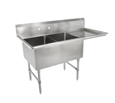 Enhance functionality with essential tools using the John Boos, 2B18244-1D18R Sink. Designed specifically for commercial restaurant use, this two-compartment sink is a must-have for any busy kitchen. With its 16300 stainless steel construction, this sink is built to withstand the demands of a high-volume environment. The two 18W x 24 front-to-back x 14 deep compartments provide ample space for washing and rinsing dishes, while the 18 right drainboard offers convenient drying and storage. The 10H boxed backsplash with a 45 top and 2 return helps to prevent water splashes and spills, keeping your workspace clean and safe. Equipped with a set of splash mount faucet holes with 8 centers and three 1-1/2" die-stamped drain openings, this sink ensures efficient water flow and drainage. The stainless steel legs with adjustable side bracing and bullet feet provide stability and allow for easy leveling. NSF and CSA-Sanitation certified, this John Boos sink guarantees exceptional quality and hygiene. Upgrade your restaurant's kitchen with the John Boos, 2B18244-1D18R Sink and experience enhanced efficiency and durability.