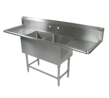 Modernize operations with smart choices using the John Boos, 42PB18244-2D30, Sink, (2) Two Compartment. This commercial-grade sink is designed to enhance efficiency and functionality in any restaurant setting. With its 2-compartment design, it allows for easy separation of dishes and utensils, streamlining the cleaning process. The 18W x 24 front-to-back x 14 deep compartments provide ample space for washing and rinsing, while the 30 left and right drainboards offer convenient drying areas. The 10H boxed backsplash with a 45 top and 2 return ensures a clean and hygienic workspace. Made from durable 14300 stainless steel, this sink is built to withstand the demands of a busy kitchen. The adjustable front and side bracing, along with the stainless steel legs and bullet feet, provide stability and flexibility. NSF and CSA-Sanitation certified, this sink meets the highest standards of cleanliness and safety. Upgrade your restaurant's operations with the John Boos, 42PB18244-2D30, Sink, (2) Two Compartment.
