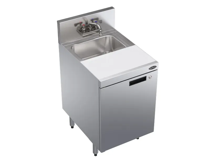 Unleash gastronomic brilliance with the Krowne Metal KR24-MC18-C Mixology Station. This Royal Series 18" Mixology Sink with Cabinet Base is the perfect addition to any commercial restaurant. With its sleek design and durable construction, this mixology station is built to withstand the demands of a busy bar or restaurant. The 18"W x 24"D underbar cabinet provides ample storage space for all your bar essentials, while the dump sink and cutting board make it easy to prepare and clean up after a busy shift. Trust Krowne Metal to deliver high-quality, reliable equipment for your commercial restaurant needs.