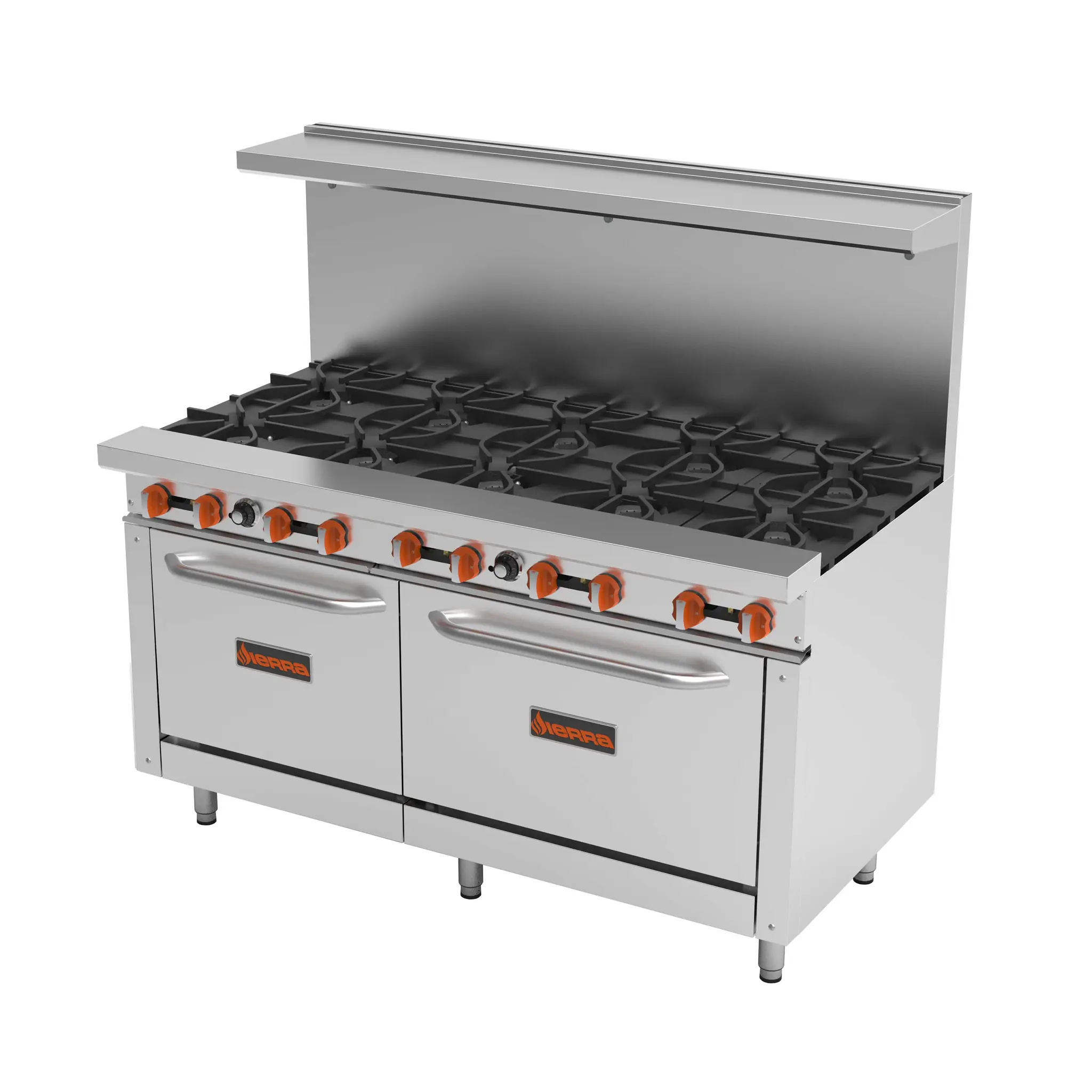 Enhance operations with versatile options through the MVP SR-10-60 Range, a 60" gas range designed specifically for commercial restaurant use. This range features (10) 30,000 BTU open burners, allowing for efficient and precise cooking. The manual controls provide easy operation and adjustment, ensuring that each dish is cooked to perfection. The range also includes (2) 30,000 BTU ovens, one space saver and one standard, both with a porcelain deck and door interior. The adjustable oven thermostat allows for precise temperature control, while the stainless steel interior and exterior ensure durability and easy cleaning. With a total of 364,000 BTUs, this range delivers powerful performance for high-volume cooking. The galvanized back and (4) 6" adjustable legs provide stability and support. The MVP SR-10-60 Range is cETLus and ETL-Sanitation certified, guaranteeing its safety and reliability. Upgrade your restaurant kitchen with this versatile and efficient gas range.