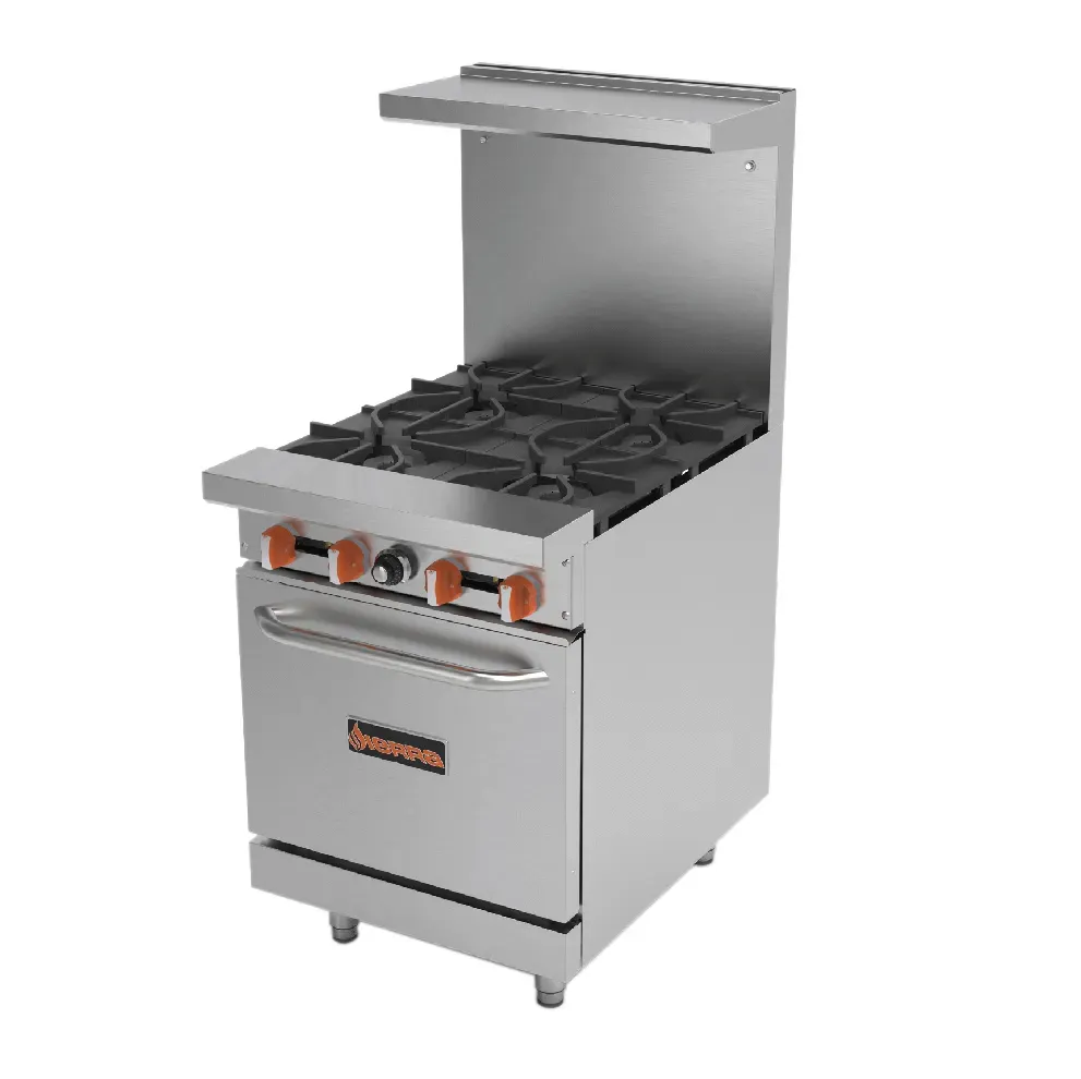 Modernize your operations with the MVP SR-4-24 Range, a 24" gas range designed specifically for commercial restaurant use. This innovative tool from MVP features four 30,000 BTU open burners, allowing you to cook multiple dishes simultaneously and efficiently. The manual controls give you precise command over the heat, ensuring consistent and delicious results every time. The range also includes a 32,000 BTU standard oven with a porcelain deck and door interior, equipped with an adjustable thermostat for optimal baking. The stainless steel interior and exterior make cleaning a breeze, while the back riser with shelf provides additional storage space. With a total of 152,000 BTU, this range delivers powerful performance to meet the demands of a busy kitchen. Trust in the quality and reliability of MVP as you elevate your restaurant's culinary capabilities with the SR-4-24 Range.