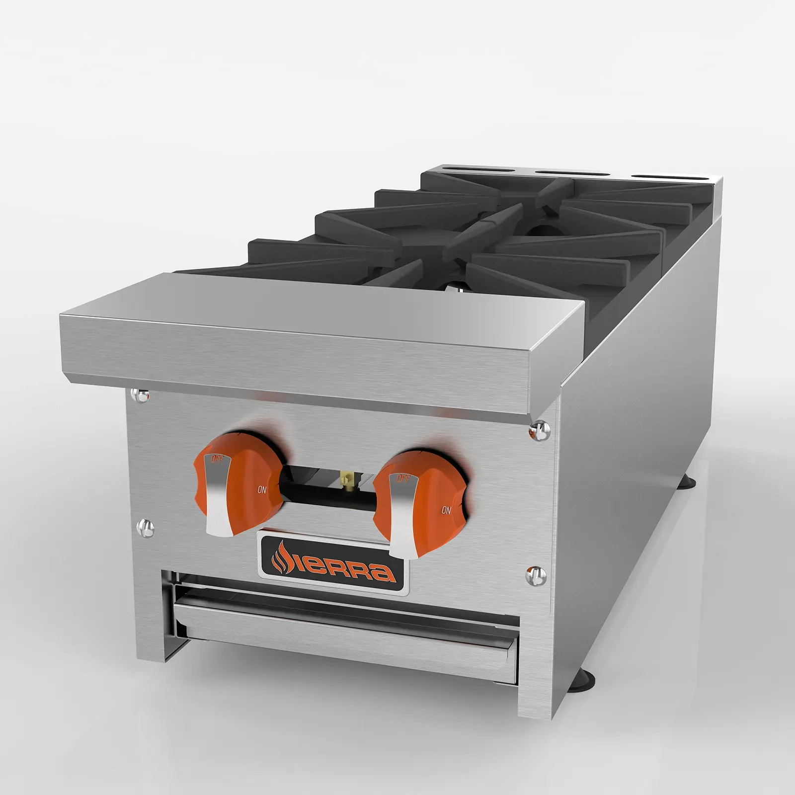 Maximize convenience using the efficient tool with MVP, SRHP-2-12, Hotplate, Countertop, Gas. This Sierra Hotplate is designed for commercial restaurant use, offering exceptional performance and durability. With two 30,000 BTU open burners, this hotplate provides powerful heat for cooking a variety of dishes quickly and efficiently. The manual controls allow for precise temperature adjustments, ensuring perfect results every time. The cast iron grates distribute heat evenly and are easy to clean, while the removable stainless steel drip tray catches any spills or drips for hassle-free maintenance. Made of stainless steel construction, this hotplate is built to withstand the demands of a busy kitchen. It also comes with four adjustable steel feet for stability and a pressure regulator for safety. With a total of 60,000 BTU, this hotplate delivers exceptional cooking performance, making it an essential addition to any commercial restaurant kitchen.