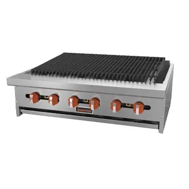 Modernize operations with intelligent choice through the MVP SRRB-48 Gas Countertop Charbroiler. Designed for commercial restaurant use, this high-performance charbroiler is a game-changer in the kitchen. With eight 16,000 BTU steel fluted burners, it delivers exceptional heat distribution and precise control for perfect grilling every time. The 3" x 22" reversible cast iron grate and cast iron radiants ensure even heat distribution and maximum flavor retention. The stainless steel construction guarantees durability and easy cleaning, while the grease trough and crumb tray make maintenance a breeze. Equipped with manual controls and a pressure regulator, this charbroiler offers versatility and efficiency. With a total of 128,000 BTUs, it can handle high-volume cooking with ease. The MVP SRRB-48 Gas Countertop Charbroiler is the ideal choice for any commercial kitchen looking to elevate their grilling game.