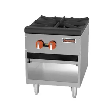Upgrade operations with versatile options through the MVP SRSP-18 Range Stock Pot. Designed for commercial restaurant use, this natural gas range features a Sierra Stock Pot Range with an 18"W size, making it perfect for busy kitchens. The range is equipped with an open dual burner and two manual controls, allowing for precise temperature adjustments. The cast iron grate and removable drip tray make cleaning a breeze, while the lower storage shelf provides convenient storage space for pots and pans. With a stainless steel construction and adjustable legs, this range is built to withstand the demands of a busy kitchen. The pressure regulator ensures safe and efficient operation, while the 100,000 BTU total power ensures fast and even cooking. Certified by cETLus and ETL-Sanitation, this range is a reliable and high-quality addition to any commercial kitchen. Upgrade your restaurant operations with the MVP SRSP-18 Range Stock Pot.