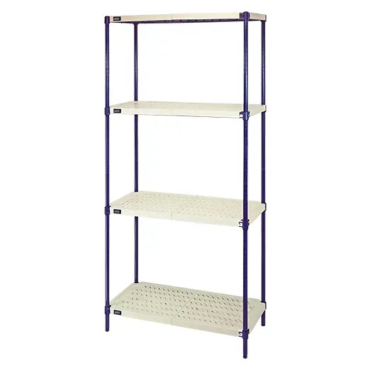 Precision Meets Efficiency with Quantum Foodservice RP2436E Shelving. This versatile shelving unit is designed to meet the demands of a commercial restaurant setting. With a 600 lb. capacity per shelf, it can easily accommodate heavy kitchen equipment, supplies, and ingredients. The open grid design allows for proper air circulation, making it suitable for dry, high humidity, wet, or walk-in cooler applications. The blue epoxy antimicrobial finish ensures a hygienic environment, while the dishwasher-safe plastic material makes cleaning a breeze. Each unit includes a wire frame, polymer mat, and split sleeves for easy assembly. NSF approved and backed by a 15-year warranty on the wire frame and a lifetime warranty on the polymer mat, this shelving unit is built to last. Trust Quantum Foodservice RP2436E Shelving to optimize your restaurant's storage space and streamline your operations.