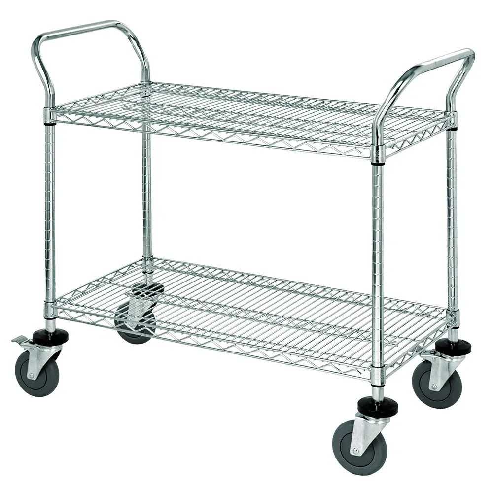 Experience professional foodservice with the Quantum Foodservice WRC-1848-2 Cart, Bussing Utility Transport. This chrome-plated cart is designed to meet the demands of a commercial restaurant setting. With a 1200 lb. capacity and (2) wire shelves, it provides ample space for transporting dishes, supplies, and more. The open base allows for easy loading and unloading, while the (2) "U" shaped handles ensure a secure grip during transport. The donut bumpers protect walls and furniture from accidental collisions, while the (4) 5" polyurethane swivel casters (2 with brakes) provide smooth maneuverability. NSF approved, this cart meets the highest standards of cleanliness and sanitation. Whether you need to transport dirty dishes to the kitchen or deliver fresh meals to your customers, the Quantum Foodservice WRC-1848-2 Cart is the perfect solution for efficient and reliable foodservice operations.