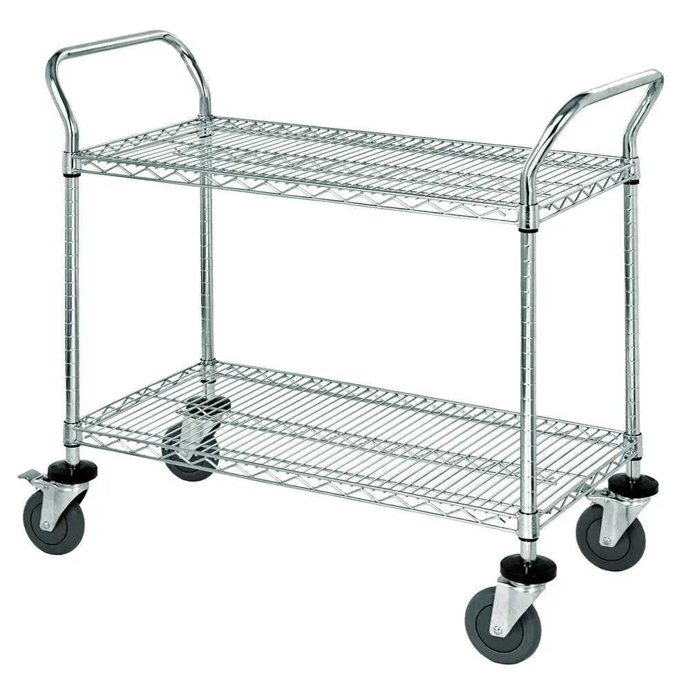 Kitchen Innovation at Your Fingertips with the Quantum Foodservice WRC-2436-2 Cart, Bussing Utility Transport. This versatile cart is designed to meet the demanding needs of commercial restaurants, providing a reliable and efficient solution for transporting items. With (2) wire shelves and a 1200 lb. capacity, this cart offers ample space for carrying a variety of items, from dishes and utensils to food supplies. The (2) "U" shaped handles ensure easy maneuverability, while the open base allows for quick and convenient loading and unloading. The donut bumpers protect walls and furniture from accidental damage, while the (4) 5" polyurethane swivel casters (2 with brakes) provide smooth and stable movement. The chrome plated finish not only adds a sleek and professional look but also ensures durability and resistance to corrosion. NSF approved, this cart meets the highest standards of sanitation and safety. Upgrade your restaurant's efficiency with the Quantum Foodservice WRC-2436-2 Cart, Bussing Utility Transport.