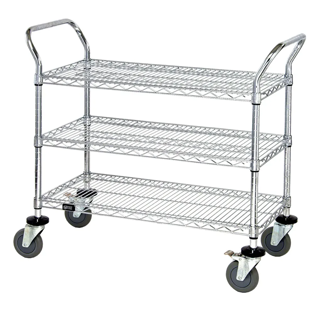 Enhance Your Kitchen Expertise with the Quantum Foodservice WRC-2448-3 Cart, Bussing Utility Transport. This chrome-plated cart is designed to streamline your restaurant operations, making it an essential tool for any commercial kitchen. With three wire shelves and a 1200 lb. capacity, this cart provides ample space for transporting dishes, ingredients, and supplies. The "U" shaped handles ensure easy maneuverability, while the open base allows for quick and convenient loading and unloading. The donut bumpers protect your walls and furniture from accidental collisions, while the four 5" polyurethane swivel casters (two with brakes) provide smooth and stable movement. NSF approved, this cart meets the highest standards of sanitation and durability. Whether you're bussing tables, restocking supplies, or delivering meals, the Quantum Foodservice WRC-2448-3 Cart is the perfect companion for your restaurant's daily operations.