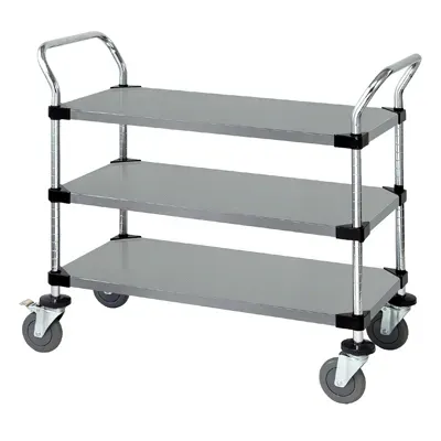 Transform Your Kitchen Performance with the Quantum Foodservice WRSC-1836-3SS Cart, Bussing Utility Transport. This versatile cart is designed to enhance efficiency in commercial restaurant settings. With its solid shelves and 1200 lb. capacity, it can easily transport heavy loads of dishes, supplies, or equipment. The "U" shaped handles provide a comfortable grip for easy maneuverability, while the open base allows for quick and convenient loading and unloading. The donut bumpers protect walls and furniture from accidental collisions, ensuring a safe working environment. Equipped with four 5" polyurethane swivel casters, including two with brakes, this cart offers smooth mobility and stability. Made with a durable 304 stainless steel finish, it is not only sturdy but also easy to clean and maintain. NSF approved, this cart meets the highest standards of sanitation and safety. Upgrade your restaurant's operations with the Quantum Foodservice WRSC-1836-3SS Cart, Bussing Utility Transport.