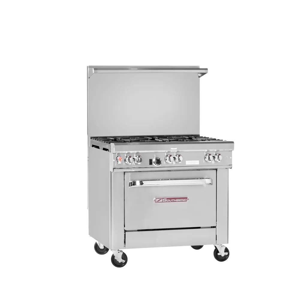 Master the art of cooking with the Southbend, 4362D, Range, 36" Restaurant, Gas. This ultimate restaurant range is designed to meet the demands of a busy commercial kitchen. With six non-clog burners and wavy grates, you can easily cook multiple dishes simultaneously. The standing pilot ensures quick and reliable ignition, while the standard oven with battery spark ignition provides even heat distribution for perfect baking results. The oven includes one rack for versatile cooking options. The stainless steel front, sides, shelf, and adjustable legs not only provide durability but also make cleaning a breeze. With a powerful 207,000 BTU, this range delivers exceptional cooking performance. It is CSA and NSF certified, ensuring its safety and quality. Whether you're running a bustling restaurant or a catering service, the Southbend, 4362D, Range, 36" Restaurant, Gas is the perfect addition to your kitchen.