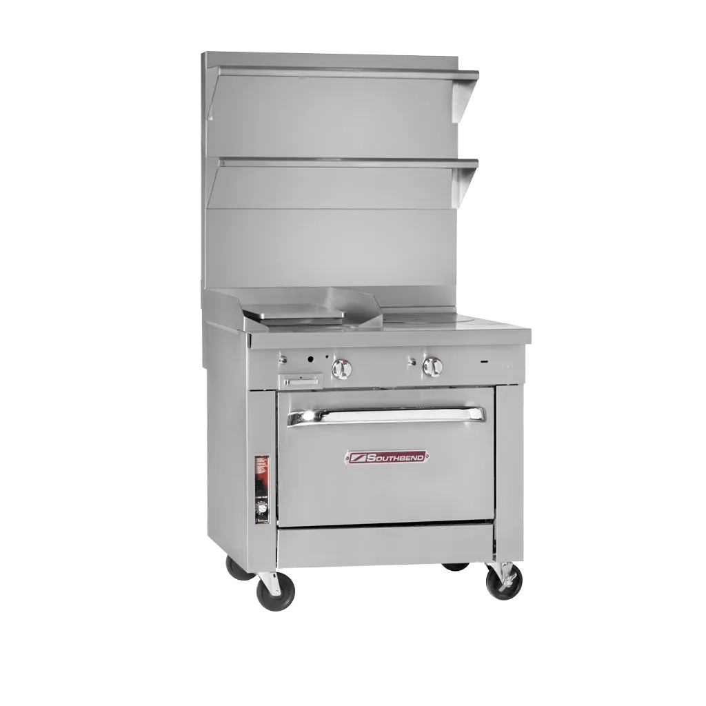 Unleash your inner chef with the Southbend P36N-BBH Range, a heavy-duty gas range designed to meet the demands of a commercial restaurant kitchen. This platinum range features four 35,000 BTU open burners, allowing you to cook multiple dishes simultaneously with precision and efficiency. The 12" hot top provides additional cooking space for simmering sauces or keeping dishes warm. With manual controls and battery spark ignition, you have full control over the cooking process. The stainless steel construction of the front, sides, rear, and exterior bottom ensures durability and easy cleaning, making it perfect for a busy restaurant environment. With a powerful 172,000 BTU output, this range delivers exceptional performance and reliability. It is CSA and NSF certified, guaranteeing its safety and quality. Upgrade your restaurant kitchen with the Southbend P36N-BBH Range and experience professional-grade cooking at its finest.