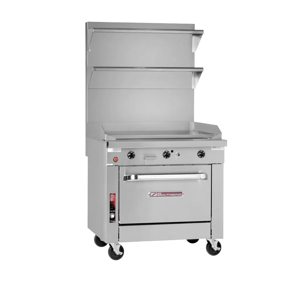 Kitchen innovation at its best, the Southbend P48N-TTTT Range is a must-have for any commercial restaurant. This platinum heavy-duty gas range is designed to meet the demands of a busy kitchen, offering exceptional performance and durability. With a 48" modular design, this range provides ample cooking space for multiple dishes at once. The 1" thick griddle plate ensures even heat distribution and excellent heat retention, allowing for perfect cooking results every time. The thermostatic controls give you precise temperature control, while the battery spark ignition ensures quick and reliable start-ups. Made with a stainless steel front, sides, rear, and exterior bottom, this range is not only easy to clean but also built to withstand the rigors of a commercial kitchen. With a powerful 128,000 BTU, this range delivers the heat needed to cook large quantities of food quickly and efficiently. NSF certified and backed by Southbend's Service First Program, the P48N-TTTT Range is a reliable and high-quality choice for any commercial kitchen.