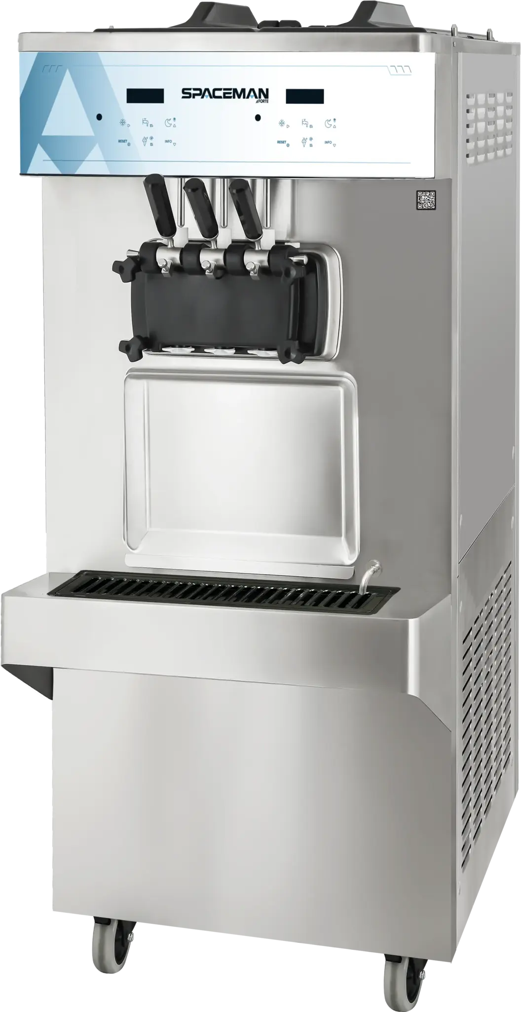 The 6378A-C also features Spaceman’s advanced pressurized air pump system, engineered for compatibility with a wide range of products and designed with fewer parts for easier use, cleaning, and maintenance. Its oversized pump and control system keep the freezing cylinders consistently full to prevent product starvation, while offering six adjustable overrun settings. This flexibility allows operators to create creamier, fluffier, lighter products while maximizing profitability and enabling everything from dipping cones to producing tall swirls and signature textures. Dual digital user interfaces simplify operation, while hopper refrigeration and built-in agitators keep product stirred, fresh, and dairy-safe throughout the day.