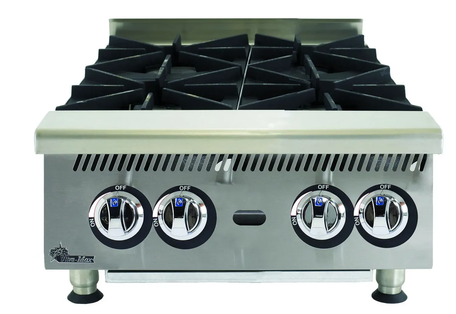 Ultra-Max® natural gas hot plates are designed for years of maintenance free operation and reliable cooking performance. Whatever the menu item, Ultra-Max hot plates will out perform the competition. The 804HA natural gas hotplate features four burners with 30,000 BTUs per burner, and a standing pilot for each burner.