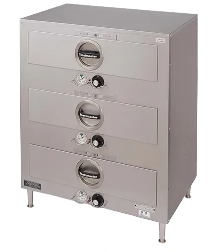 Ensure durability with the Toastmaster 3C84DT09 Warming Drawer, Free Standing. This food warming drawer unit is designed to withstand the demands of a commercial restaurant setting. With three spacious drawers, each capable of holding three 12" x 20" x 5" pans, you'll have plenty of room to keep your dishes warm and ready to serve. The thermostatic controls allow you to easily adjust the temperature to meet your specific needs, while the fully insulated design ensures efficient heat retention. Made in the USA with a stainless steel exterior finish, this unit not only looks sleek but is also built to last. The 4" legs provide stability and make it easy to clean underneath. Trust Toastmaster for reliable and high-quality warming solutions for your restaurant.
