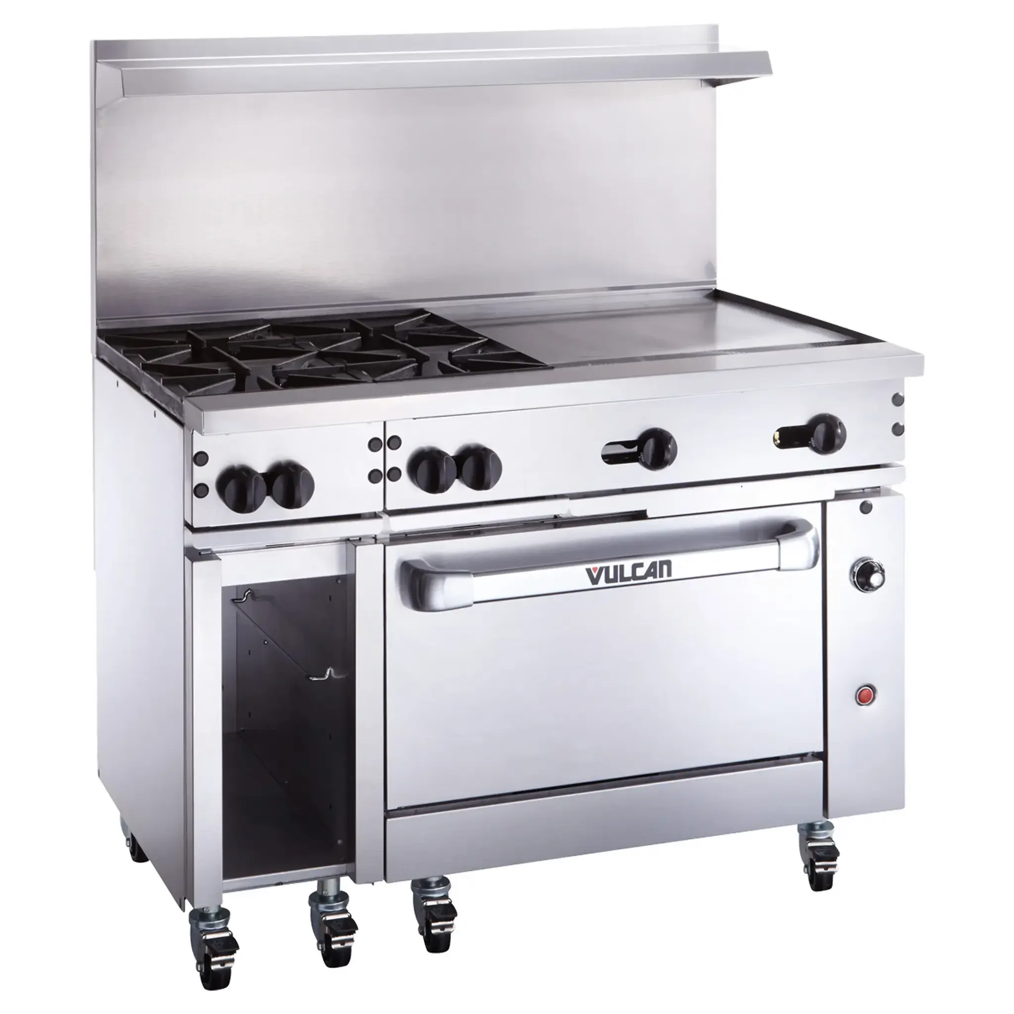 Unleash culinary creativity with the Vulcan 48C-2B36G Range, a must-have for any commercial restaurant. This gas-powered endurance restaurant range is designed to meet the demands of a busy kitchen. It features two 30,000 BTU burners with lift-off burner heads, allowing for precise heat control and efficient cooking. The 36" griddle, with its 7/8" thick plate, provides a spacious and even cooking surface for pancakes, burgers, and more. The manual controls make it easy to adjust the temperature to suit your culinary needs. The stainless steel construction of the front, sides, backriser, and lift-off high shelf ensures durability and easy cleaning. The fully MIG welded chassis and 6" adjustable legs provide stability and flexibility. With a powerful 155,000 BTU convection oven, this range can handle all your baking and roasting needs. CSA Flame, CSA Star, and NSF certifications guarantee safety and quality. Upgrade your kitchen with the Vulcan 48C-2B36G Range and experience the difference in performance and efficiency.