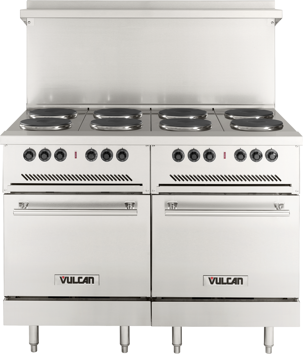 Elevate your dining experience with the Vulcan EV48SS-8FP208 Range. This 48" electric restaurant range is designed to meet the demands of a busy commercial kitchen. With (8) 2.0 kW French hotplates, you can easily cook multiple dishes simultaneously, increasing efficiency and productivity. The 9-1/2" round hotplates provide even heat distribution for consistent cooking results. The infinite controls allow precise temperature adjustments, giving you full control over your culinary creations.