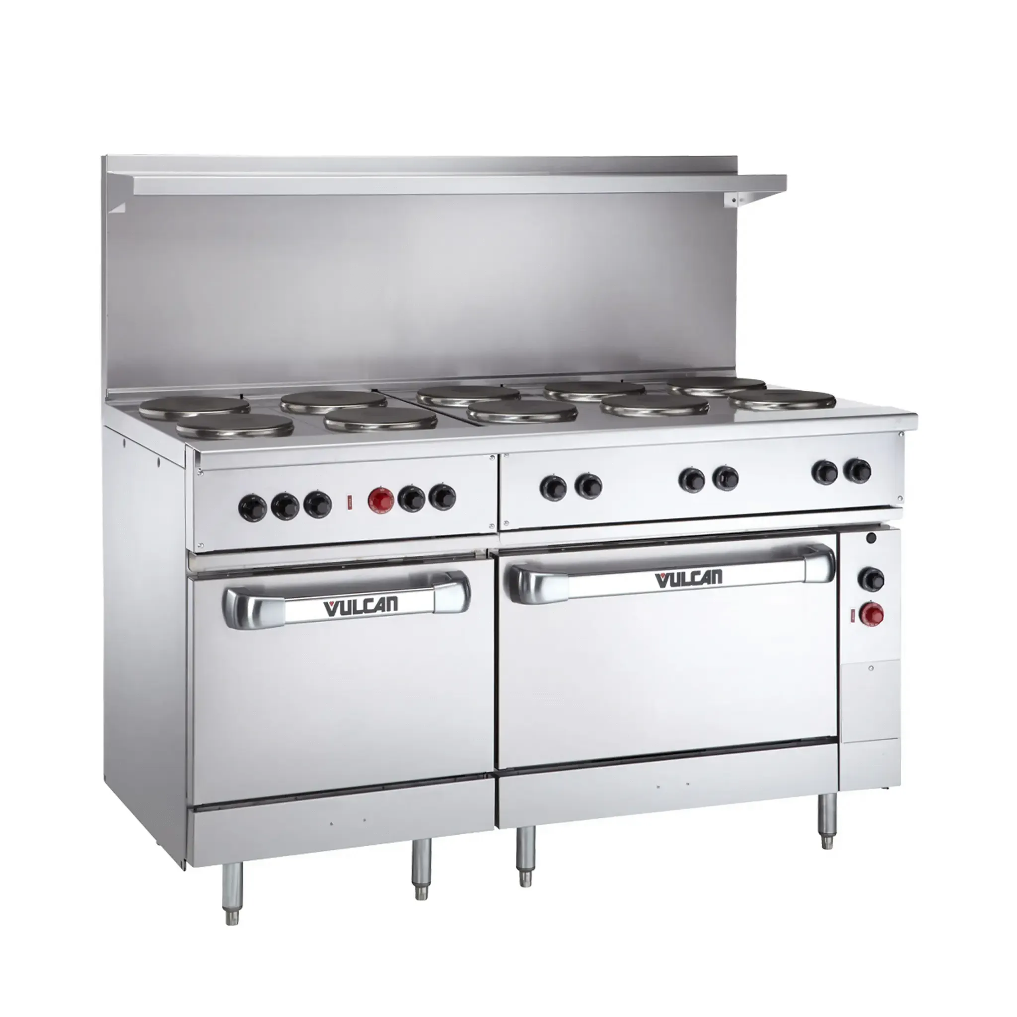 Introducing the Vulcan EV60SS-10FP480, a range designed to craft culinary wonders in commercial restaurants. This electric restaurant range features a spacious 60" size, perfect for handling high-volume cooking. With (10) 2.0 kW French hotplates, each equipped with a 9-1/2" solid cast iron plate and infinite controls, precise cooking is at your fingertips. The range also includes (1) standard and (1) oversized oven, each with a rack, allowing for simultaneous baking and roasting. The stainless steel front and sides not only provide durability but also add a sleek and professional look to any kitchen. The single-deck high shelf and 6" legs offer convenient storage and easy cleaning. Powered by 480v, this Vulcan range is built to withstand the demands of a busy restaurant kitchen. Elevate your culinary creations with the Vulcan EV60SS-10FP480 range.