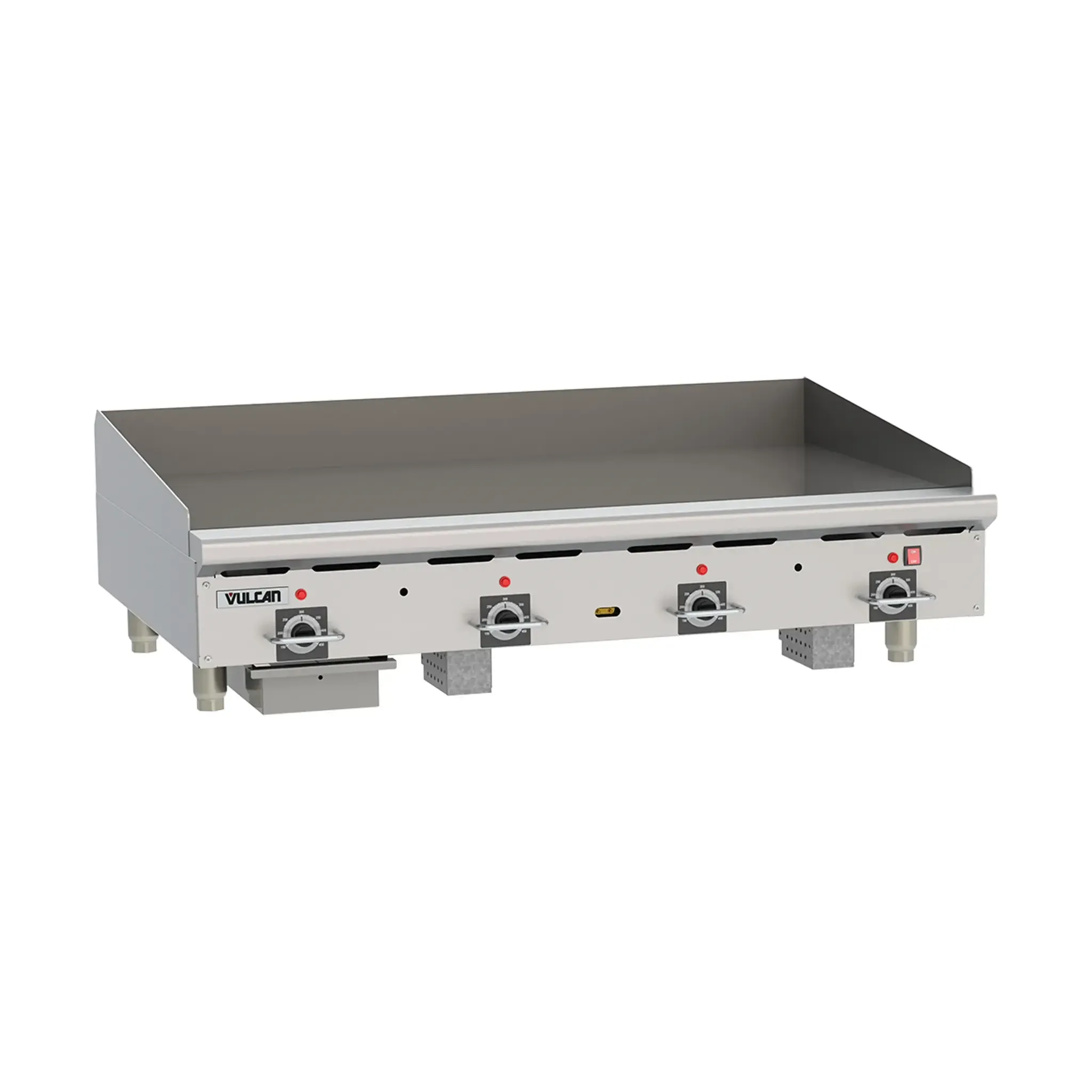 Elevate your culinary experience with the Vulcan RRE24E Electric Countertop Griddle. This heavy-duty griddle is designed to meet the demands of a commercial restaurant kitchen. With a 24" x 24" cooking surface, it provides ample space to cook a variety of dishes simultaneously. The 3/4" thick composite griddle plate with a stainless steel cooking surface ensures even heat distribution and excellent heat retention. The bottom-mounted snap action thermostat, located every 12", allows for precise temperature control, ensuring consistent cooking results. The stainless steel construction of the front, sides, front top ledge, and front grease trough not only adds durability but also makes cleaning a breeze. The 4" back and tapered side splashes help contain any splatters, keeping your kitchen clean and safe. With adjustable legs, you can easily level the griddle on any countertop. NSF and cCSAus certified, this Vulcan griddle is a reliable and efficient addition to any commercial kitchen.