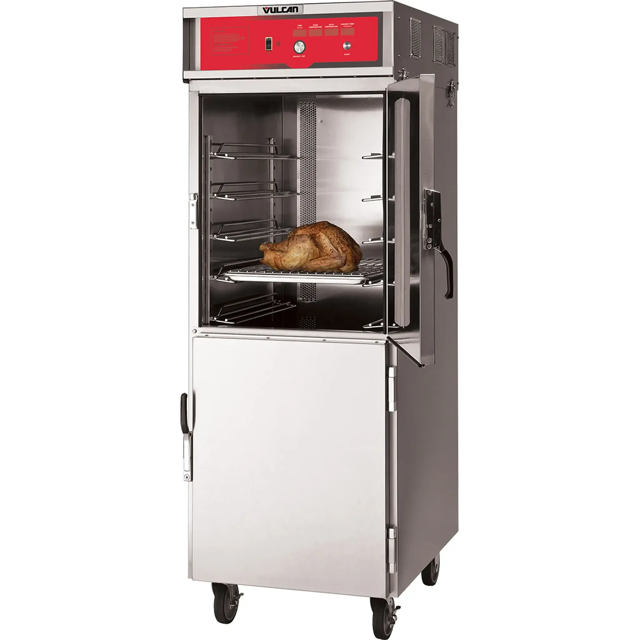 Cooking at its finest, the Vulcan VCH16 Cabinet Cook/Hold/Oven is a must-have for any commercial restaurant. With its electronic solid state controls and easy-to-operate knob, this cook/hold cabinet ensures precise temperature control for perfect results every time. It cooks at 350 F and holds at 250 F, allowing you to prepare a wide variety of dishes and keep them warm until serving. The cabinet has a generous capacity of 16 bun pans or 32 steam table pans, providing ample space for all your culinary creations. Made with a stainless steel interior and exterior, this cabinet is not only durable but also easy to clean. The 5" casters, with 2 swivel and locks, make it easy to move around the kitchen as needed. Powered by 208-240v/50/60/1-ph, this cabinet is a reliable and efficient addition to any commercial kitchen. Trust Vulcan, a trusted name in the industry, to deliver exceptional quality and performance.