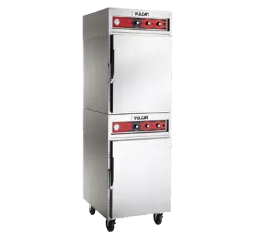 Introducing the Vulcan VRH88 Cook/Hold Cabinet, designed to simplify restaurant operations. This double-deck, mobile cabinet is a game-changer for commercial kitchens. With its mechanical temperature controls, you can easily roast your dishes at a consistent 250 F, ensuring perfect results every time. The cabinet has a generous capacity of 16 sheet pans or 32 hotel pans, allowing you to cook large quantities of food in one go. It comes with six wire shelves, providing ample space for your culinary creations. Made with stainless steel construction, this cabinet is built to withstand the demands of a busy restaurant kitchen. The Vulcan VRH88 also includes a stacking kit, allowing you to maximize your storage space. With its 5" casters, two of which are swivel with locks, this cabinet is easy to maneuver and secure in place. Upgrade your restaurant kitchen with the Vulcan VRH88 Cook/Hold Cabinet and experience the convenience and efficiency it brings.