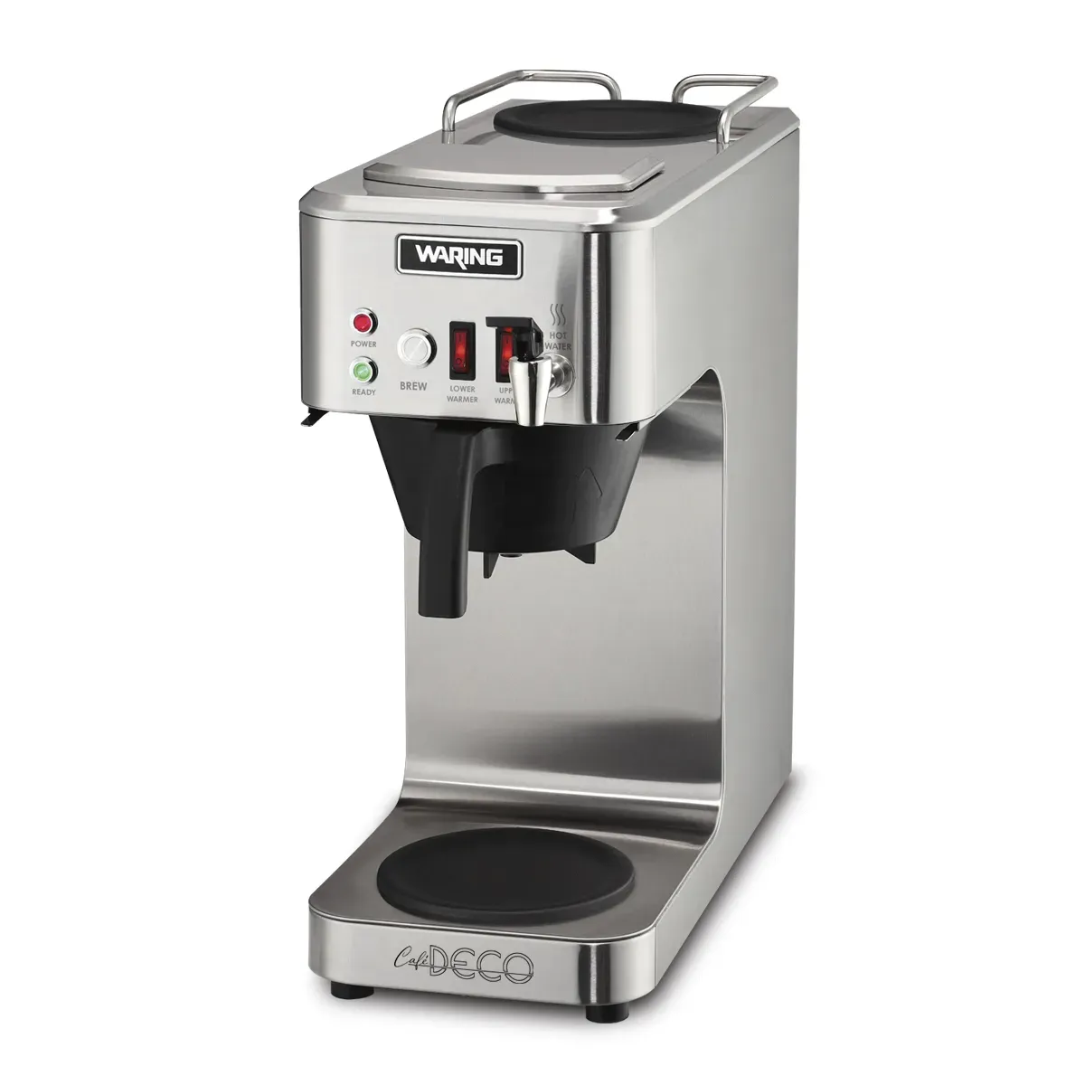 Introducing the new Caf DECO Series coffeemaker designed to meet high demand for fresh-brewed coffee at today' s busy foodservice operations. Pour cold water through the top or use a plumbing connection. At the push of a button, coffee brews to perfection in minutes. Switch on one or both of the warmers to maintain the ideal serving temperature. Stainless steel construction ensures durability and wipes clean in seconds. A front-mounted faucet provides the added convenience of easily drawing hot water.